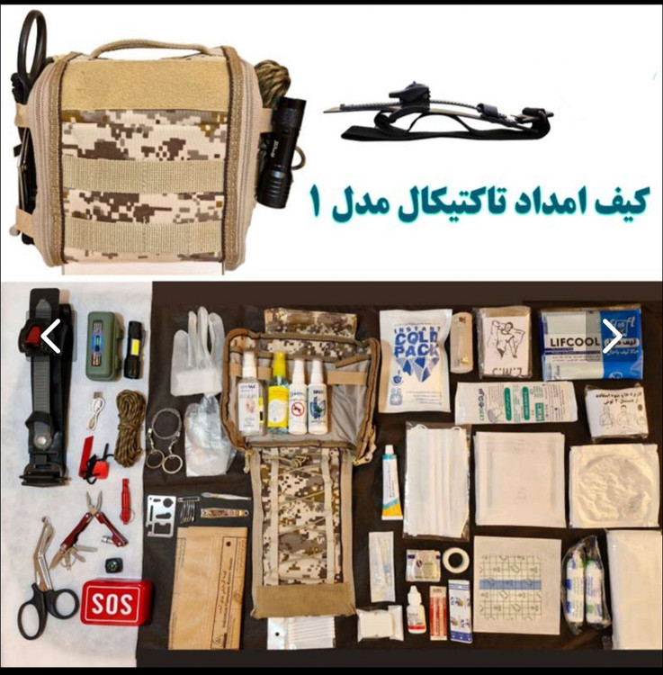 کیف کمکهای اولیهدشامل جراغ قوه پک ابزار sos 1 ، قیچی حرفه ای بانداژ، پک گرمایش ، پک خود سرمایش ناخن گیر ، پنس پماد سوختگی، اسپری زخم باز ، اسپری صددرد ، دافعه حشرات الکل ،سوخت جامد الکل ،گوش پاک کن: دستمال سه گوش سنجاق قفلی ، پد الکلی ، گاز وازلینه، گاز استریل ، سرنگ ، چسب زخم ، پد چسب ضد اب ، پودر انعقاد خون، تیغ جراحی، چسب حلقه ای، ملحفه زیر مصدوم، باند معمولی، باند کشی، ماسک سه لایه ، پتوی نجات ، دستکش ونیل ، دستکش نایلونی ، کارتن بسته بندی